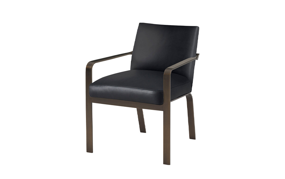以俐落線條回應傳統扶手椅的優雅語彙。全包覆椅身搭配不鏽鋼框架,經過古銅拉絲工藝細膩處理,能與當代或經典家具完美融合,為空間增添精緻氣度。