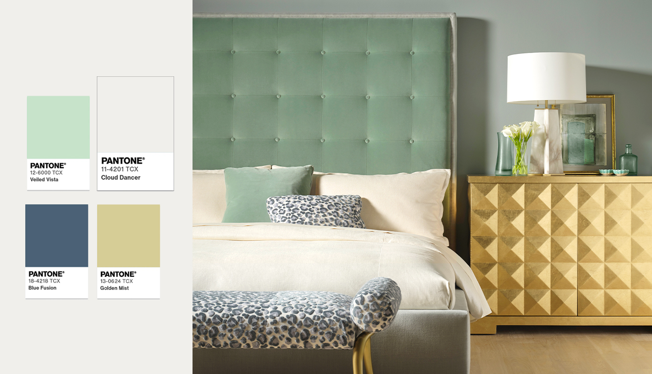 雲舞白 Cloud Dancer 作為空間的核心色調,以柔和而內斂的姿態融入臥室場景,在光影流轉之間,形塑出輕鬆而安定的視覺基底, 薄霧綠景 Veiled Vista 的清新氣息,以及 柔霧金黃 Golden Mist 的溫潤光澤,彼此交織卻不互相干擾,讓色彩在低對比中展現細緻變化。