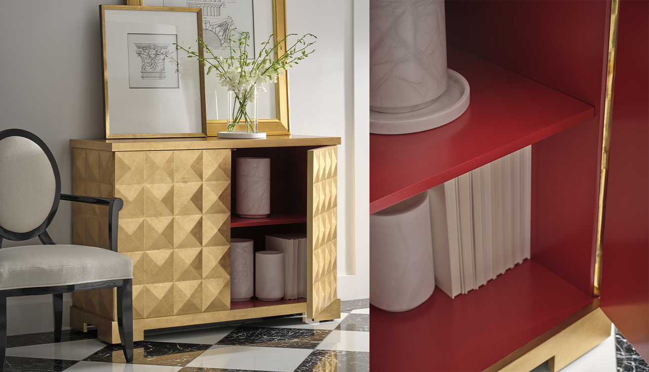 在收納家具中,Diamond Chest 是極具收藏意味的一件作品。它由美國優雅設計大師 Barbara Barry 構思,門片以實木雕刻的菱格紋堆疊出立體光影,外層覆以柔和拋光的金箔塗裝,打開櫃門時則是令人意外的紅色內層。這抹紅色與前述波爾多紅、ASSOULINE Red 形成呼應,使櫃體不再只是功能收納,而像是一只小型展示櫃,替空間留下一道精準而懸念十足的色彩轉折。