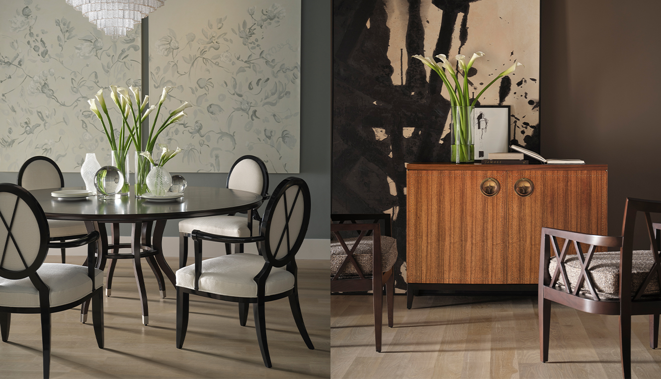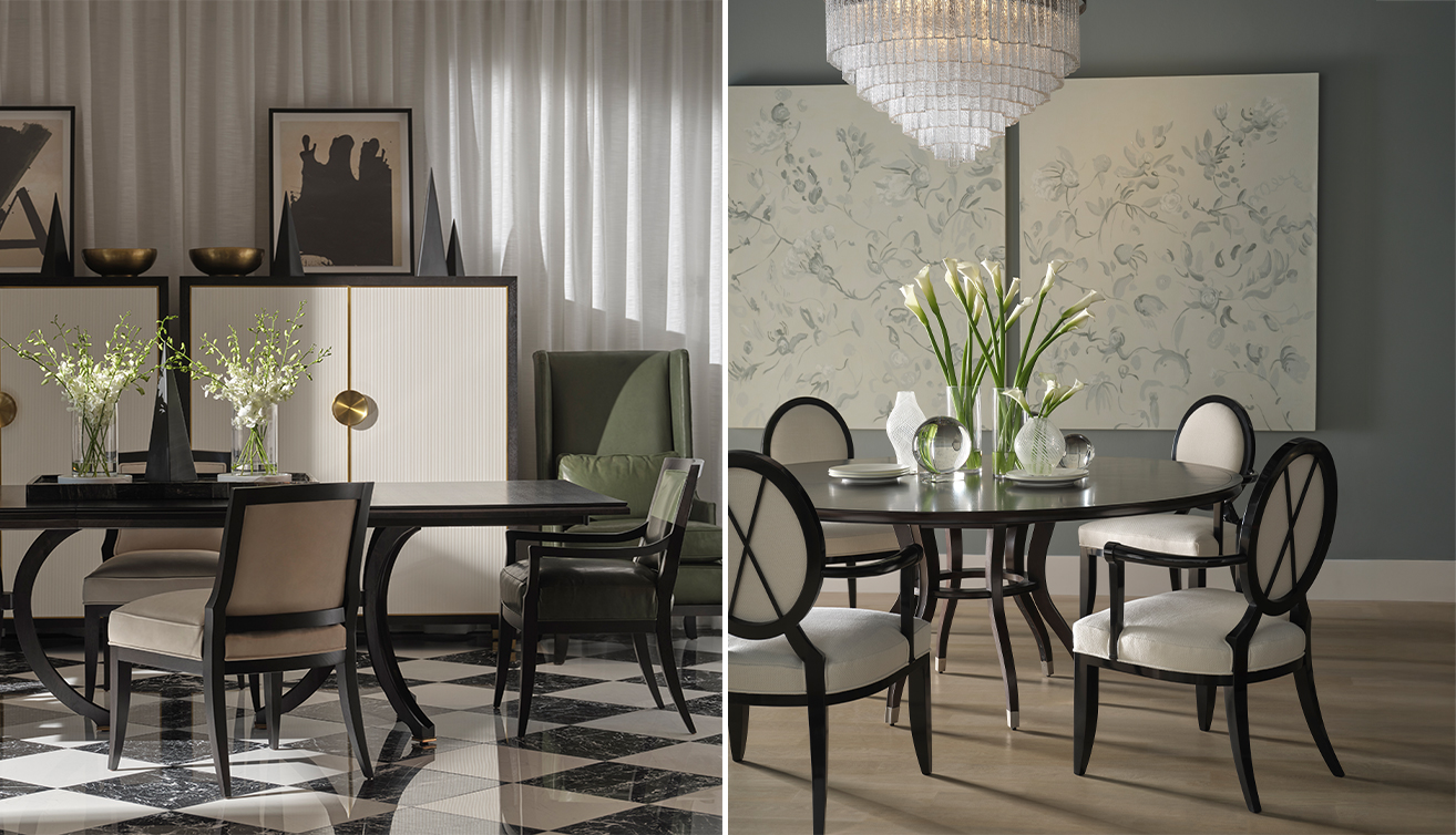 雕塑語彙當代設計師 Laura Kirar 推出的 Vienna Dining Table 與 Vienna Side Chair、Vienna Arm Chair 則更具藝術感。餐桌以長方桌面結合雕塑感桌腳,胡桃木搭配拋光古銅金屬細節,並附延伸桌板,提高宴客時的彈性;單椅則從層疊珠寶汲取靈感,椅背如畫框般勾勒出柔和線條,為餐空間帶來近似珠寶盒般的細膩光影。