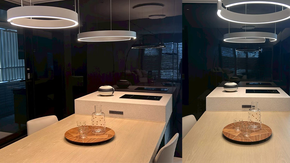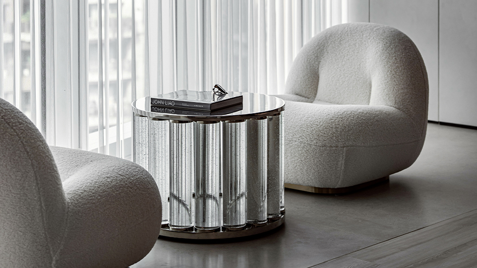 餐桌選用 L'Objet 幾何桌上轉盤,作為共享時刻的中心,搭配 POLSPOTTEN 諾布點點玻璃杯與酒壺,使餐敘互動在正式與隨性之間取得平衡。材質與造型在光線中呈現層次,回應日常使用的節奏感。
