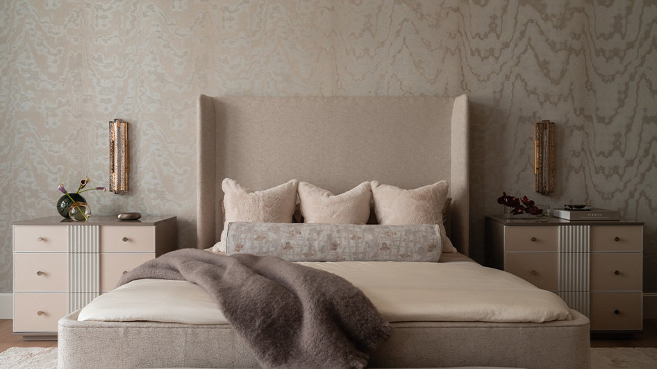 臥室以柔和中性色與細膩材質鋪陳,營造出包覆而放鬆的休憩氛圍。高背床頭成為視覺與情緒的依靠,織品層次與低調光源讓空間自然沉靜下來。整體配置不追求多餘裝飾,而是透過比例、觸感與光線,讓睡眠回歸純粹,成為一日節奏中最溫柔的停靠點。