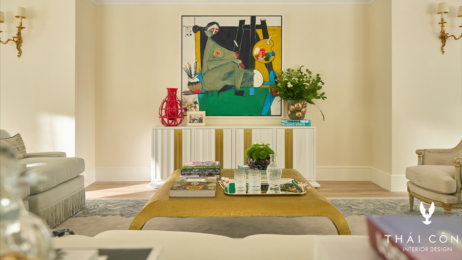 THÁI CÔNG 於本案中選用 Baker-McGuire 貝克傢俱,讓家具在空間中承載交流、休憩與日常使用。沙發、單椅與茶几圍繞中央場域展開,使客廳成為一處可停留、可使用、也能細細觀看藝術的生活核心。