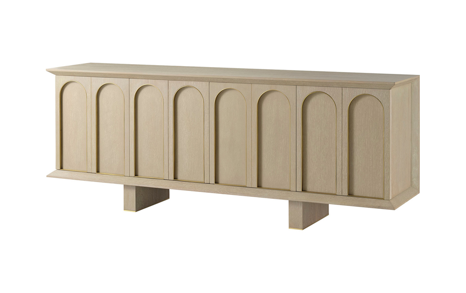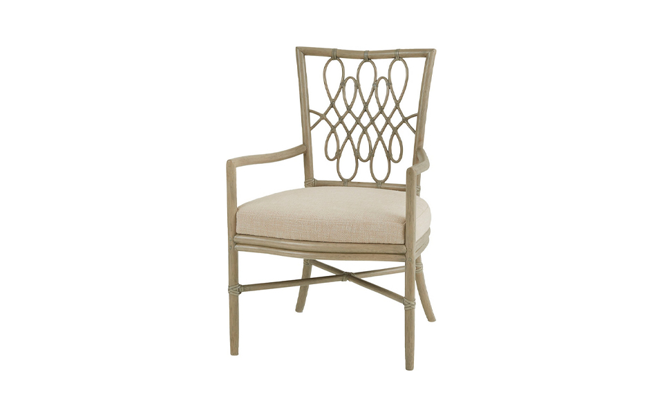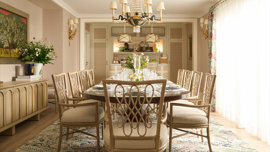 以柔和中性色為基調,結合淺色木質家具與細緻雕刻線條,呈現內斂而穩定的新古典風格。餐椅背部的弧形與編織語彙,為空間注入輕盈節奏,搭配比例優雅的餐桌,使整體視覺在秩序中保有流動感。