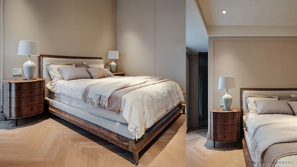 主臥空間融合美式、現代與自然語彙,深淺適中的桃花芯木色調,為休息時光鋪陳出溫暖而安定的背景。整體氛圍柔和內斂,讓臥室成為真正回歸自我的私領域。