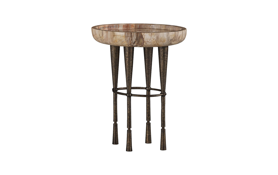 在 Bill Bensley 的設計語彙中,自然材質是展現空間氣場的靈魂。令人著目的「木化石 (Petrified Wood)」,起源是數百萬年前馬達加斯加史前森林被火山灰瞬間掩埋後,歷經漫長的礦物轉化而成的天然奇蹟,完美封存古老樹木的年輪與生命紋理,物理特性卻已蛻變為摩氏硬度達 7 的半寶石,其堅韌程度甚至超越花崗岩,具備耐刮、耐熱且絕無孔隙的永恆特質。木化石家具目前被視為高端訂製家具市場中最具收藏價值的天然材質之一。