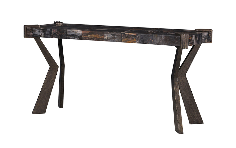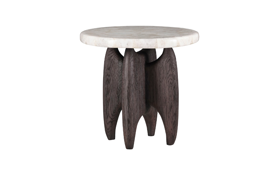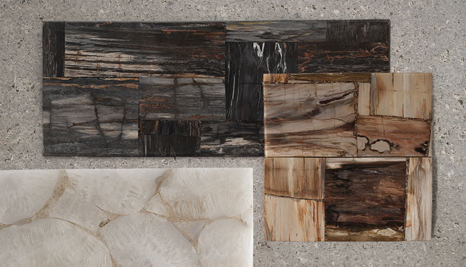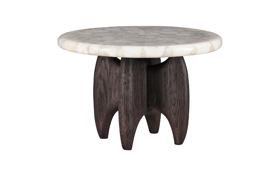 從桌几、座椅到裝飾單品,該系列展現了豐富且有機的質地:黑棕色木化石釋放出古老的力量感;晶瑩的水晶白瑪瑙讓人聯想起雨林瀑布;噴砂橡木則揭示了自然紋理之美。