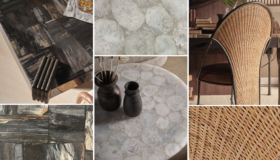 為了中和木化石那種來自地心深處的沉穩力量,Bill Bensley 巧妙揉合質地剔透、宛如雨林飛瀑的「水晶白瑪瑙 (Crystal White Agate)」。這種半寶石的澄澈感,與 McGuire 傳承半世紀、極具手感的蒸彎藤材與噴砂橡木相互堆疊,形成了一種強烈的視覺對比。這種「異材質」的碰撞,讓家具不再只是室內擺飾,而是散發出一種原始而穩定的能量。透過這些材質的交織,McGuire 成功地將大自然的「粗獷」與當代工藝的「精緻」完美融合,詮釋了何謂真正經得起時間洗鍊的「自然奢華」,使家具同時具備力量與通透感。