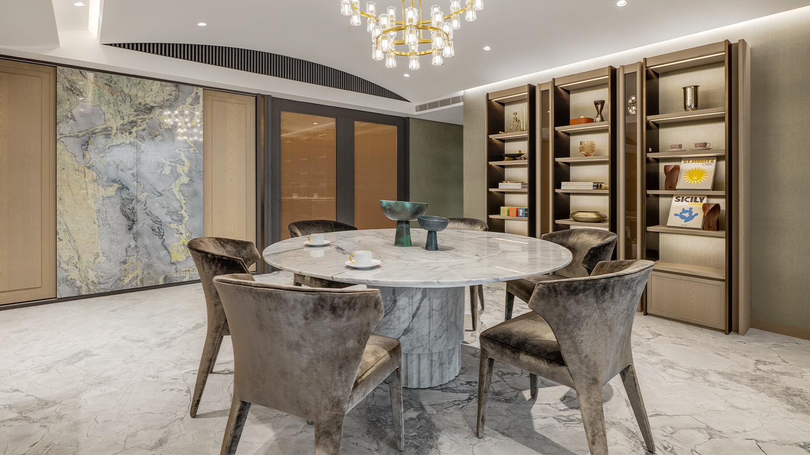 空間搭配設計風格選物 MICHELUZZI 的 Murano 手工玻璃作品,以通透質地與柔和色彩帶來光影變化; L'OBJET 的器皿,透過細膩工藝與雕塑感造型,使餐桌與展示櫃多了一份精緻的生活氣息; POLSPOTTEN 則以當代設計語彙與俐落比例,為空間加入輕盈而富有設計感的點綴。
