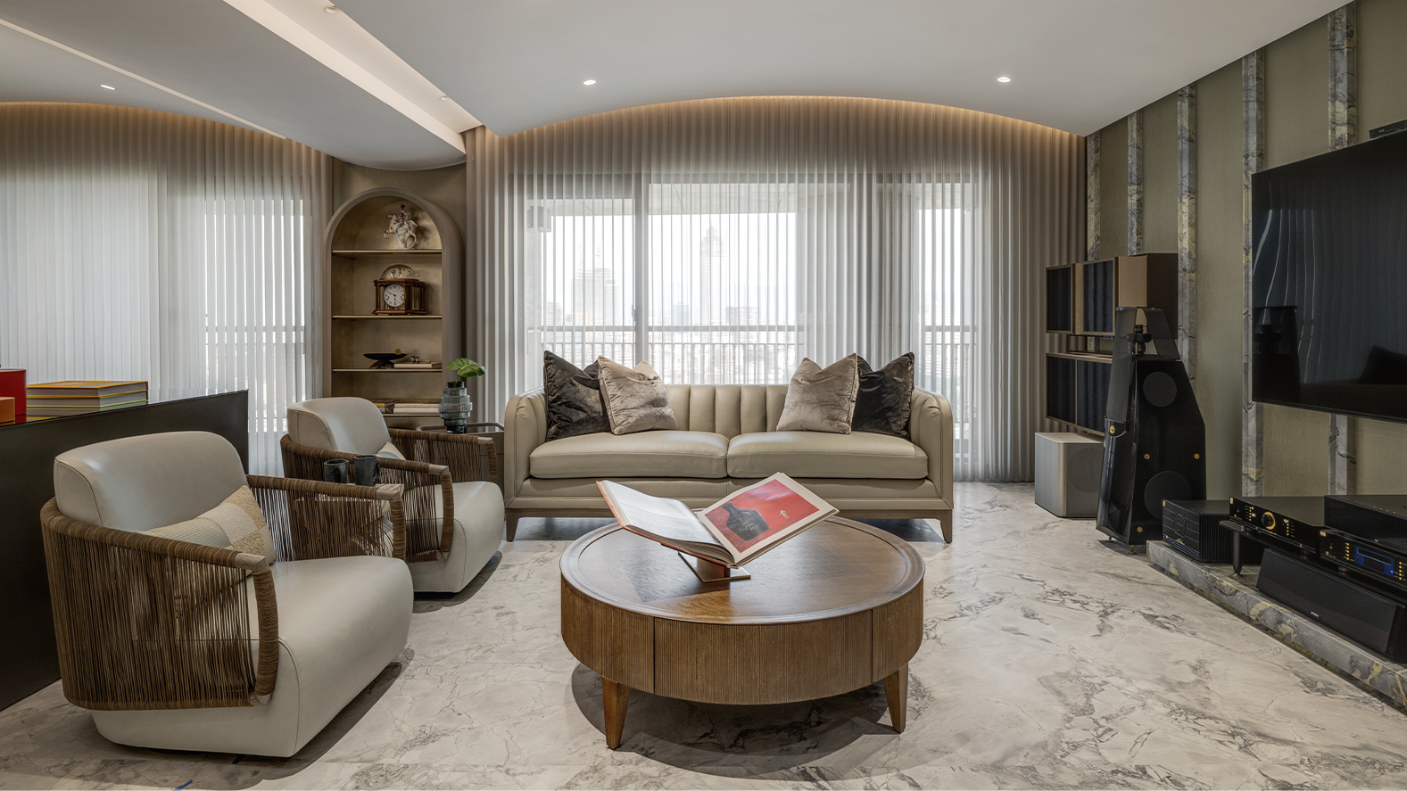 客廳整體空間中性色調,大面落地窗將城市景觀引入室內,使視覺更加開闊。家具配置以圓潤線條與自然材質為主,整體氛圍舒展而安定。