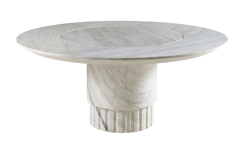 餐廳以圓形餐桌成為空間視覺中心。圓桌形式讓用餐氛圍更為親密,也讓交流自然展開。石材桌面在光線映照下呈現柔和質感,搭配沉穩比例的餐椅,使餐廳呈現簡潔而安定的生活場景。