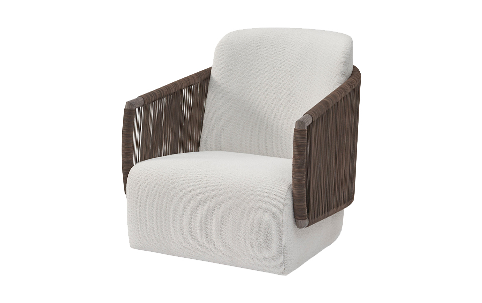 單椅搭配 Baker Living 貝克拼布工藝抱枕,以 Baker-McGuire 展廳使用的比利時織品重新設計製作。拼布工藝讓布料呈現細緻層次,也為客廳座席增添柔軟而溫潤的生活質感。